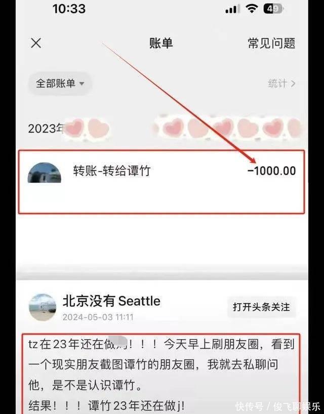 2023年,就有网友晒出他的一又友嫖了谭竹,花了一千块。附上截图。